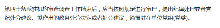 第40條規定,派駐機構審查調查工作結束后,應當按照規定進行審理,提出紀律處理或者黨紀處分建議、擬作出的政務處分決定或者處分建議,通報駐在單位黨組(黨委);