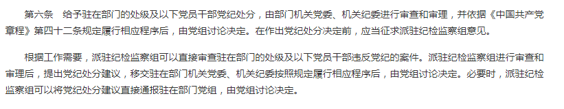 第6條第1款“給予駐在部門的處級及以下黨員干部黨紀處分,由部門機關黨委、機關紀委進行審查和審理,并依據《中國共產黨章程》第四十二條規定履行相應程序后,由黨組討論決定。在作出黨紀處分決定前,應當征求派駐紀檢監察組意見‘;