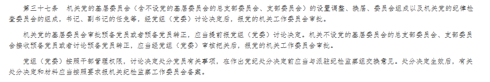 《中國共產黨黨和國家機關基層組織工作條例》第37條第3款規定“黨組(黨委)按照干部管理權限,討論決定處分黨員有關事項,在作出黨紀處分決定前應當與派駐紀檢監察組交換意見。處分決定生效后,有關處分決定和材料應當按照要求報機關紀檢監察工作委員會備案”。