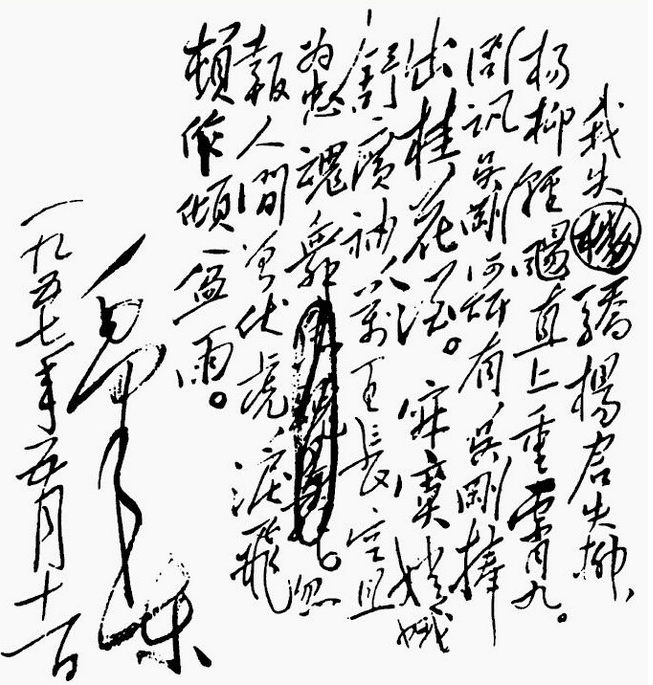 賞析:李淑一是楊開慧生前的同學(xué)和好朋友,她與丈夫柳直荀是楊開慧介紹認(rèn)識(shí)的。柳直荀參加革命,離家數(shù)載,犧牲后多年李淑一才知道他過(guò)世的消息。李淑一孤寂多年,心里的痛苦可想而知。建國(guó)后,李淑一在湖南長(zhǎng)沙第十中學(xué)教書,和毛澤東取得了聯(lián)系。1957年2月,她在給毛澤東的一封信中附上了自己1933年作的一首《菩薩蠻.驚夢(mèng)》:“蘭閨寂寞翻身早,夜來(lái)觸動(dòng)離愁了。底事太難堪,驚儂曉夢(mèng)殘。征人何處覓?六載無(wú)消息。醒憶別伊?xí)r,滿衫清淚滋”。李淑一這首詞寫得溫婉動(dòng)人,無(wú)限悲愁。有著同樣情節(jié)的毛澤東看完了很受感動(dòng),也被勾起了心中無(wú)限的感慨,就寫了這首《蝶戀花》送給了李淑一。上闋“驕楊”指毛澤東的妻子楊開慧,“柳”指李淑一的丈夫柳直荀,1932年9月在湖北洪湖革命根據(jù)地被害。毛澤東和李淑一兩人的愛(ài)人都在革命斗爭(zhēng)中犧牲了。毛澤東主席通過(guò)異乎尋常的奇絕想象,用楊、柳二人的姓氏比喻楊花和柳絮,更進(jìn)一步想象楊柳二人的忠魂像楊花和柳絮一樣飄到了天上,吳剛得知二位烈士到來(lái),捧出了桂花酒作為招待。下闋更加浪漫而感人:幽居在月亮里的嫦娥仙女也為烈士忠魂感動(dòng),揮動(dòng)巨大的裙袖,在萬(wàn)里長(zhǎng)空中飄然起舞。楊、柳二位烈士忽然聽到人間傳來(lái)捷報(bào),反動(dòng)派被打垮了,熱淚滾滾而出,落到人間,就變成了瓢潑大雨,生動(dòng)而感人,一幅美妙的畫面就展開在我們眼前。這首詞美好而又悲壯,凄涼而又高蹈,是毛澤東的為數(shù)不多的充滿感情色彩又溫柔纏綿的詩(shī)詞作品之一。吳剛和嫦娥是家喻戶曉的神話人物,但是毛澤東通過(guò)大膽的想象和瑰麗的敘述,推陳出新,賦予神話更豐富也更“革命化”的內(nèi)涵,是深情、浪漫、現(xiàn)實(shí),以及革命樂(lè)觀主義的完美結(jié)合。