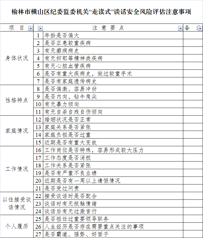 榆林市橫山區紀委監委機關“走讀式”談話安全風險評估注意事項