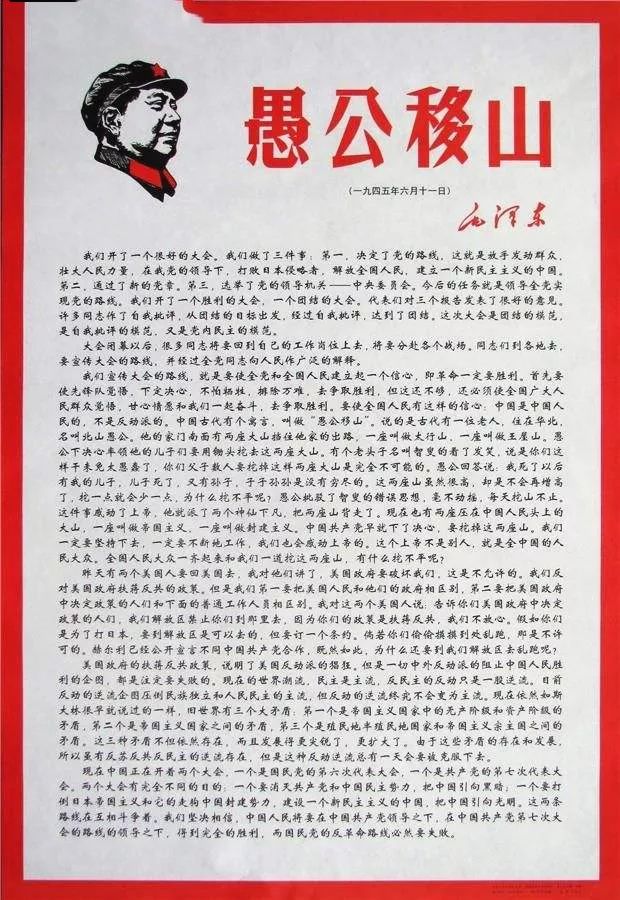 我們宣傳大會的路線,就是要使全黨和全國人民建立起一個信心,即革命一定要勝利。首先要使先鋒隊覺悟,下定決心,不怕犧牲,排除萬難,去爭取勝利。但這還不夠,還必須使全國廣大人民群眾覺悟,甘心情愿和我們一起奮斗,去爭取勝利。要使全國人民有這樣的信心:中國是中國人民的,不是反動派的。中國古代有個寓言,叫做“愚公移山”。說的是古代有一位老人,住在華北,名叫北山愚公。他的家門南面有兩座大山擋住他家的出路,一座叫做太行山,一座叫做王屋山。愚公下決心率領他的兒子們要用鋤頭挖去這兩座大山。有個老頭子名叫智叟的看了發笑,說是你們這樣干未免太愚蠢了,你們父子數人要挖掉這樣兩座大山是完全不可能的。愚公回答說:我死了以后有我的兒子,兒子死了,又有孫子,子子孫孫是沒有窮盡的。這兩座山雖然很高,卻是不會再增高了,挖一點就會少一點,為什么挖不平呢?愚公批駁了智叟的錯誤思想,毫不動搖,每天挖山不止。這件事感動了上帝,他就派了兩個神仙下凡,把兩座山背走了。現在也有兩座壓在中國人民頭上的大山,一座叫做帝國主義,一座叫做封建主義。中國共產黨早就下了決心,要挖掉這兩座山。我們一定要堅持下去,一定要不斷地工作,我們也會感動上帝的。這個上帝不是別人,就是全中國的人民大眾。全國人民大眾一齊起來和我們一道挖這兩座山,有什么挖不平呢?