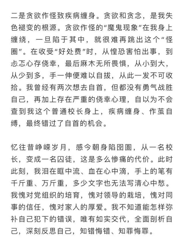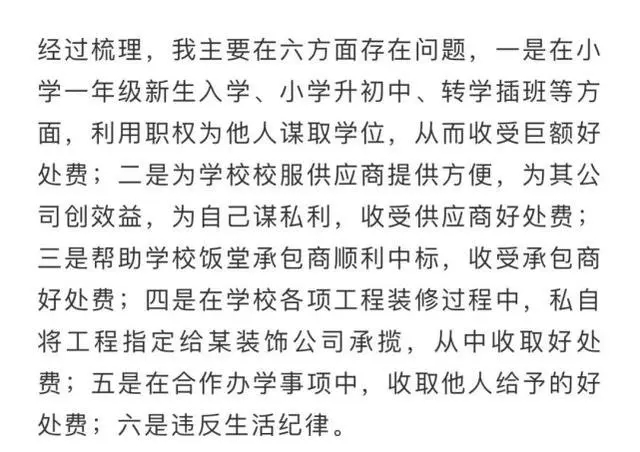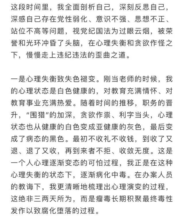 我被帶到辦案點之后,內心一直在煎熬,腦袋還沒有轉過彎來,經過辦案人員耐心、專心、細心的教誨,給我上了一堂又一堂人生中最深刻的黨性教育課、法規教育課、人生感悟課。這么多年來,幾乎都是我給別人上課,很少有別人給我上課,但在這里受到的教育卻是最深刻的、最動人的,令我不斷反思自己,回憶這些年來所犯下的錯誤。在學校時,我常給學生、家長上思想品德課,臺上說道理夸夸其談,臺下收錢財理所當然。當辦案人員把我這些年來收受的好處費計算出來的時候,我驚呆了,我竟然收受了如此巨額的錢財。俗話說“凡走過必留痕跡”,確實如此,自己當校長十幾年,期間犯下的錯誤永遠不可磨滅。那些錯誤就像洶涌而來的巨浪,淹沒了我曾經取得的所有榮譽,把我推向了回不了頭的彼岸。