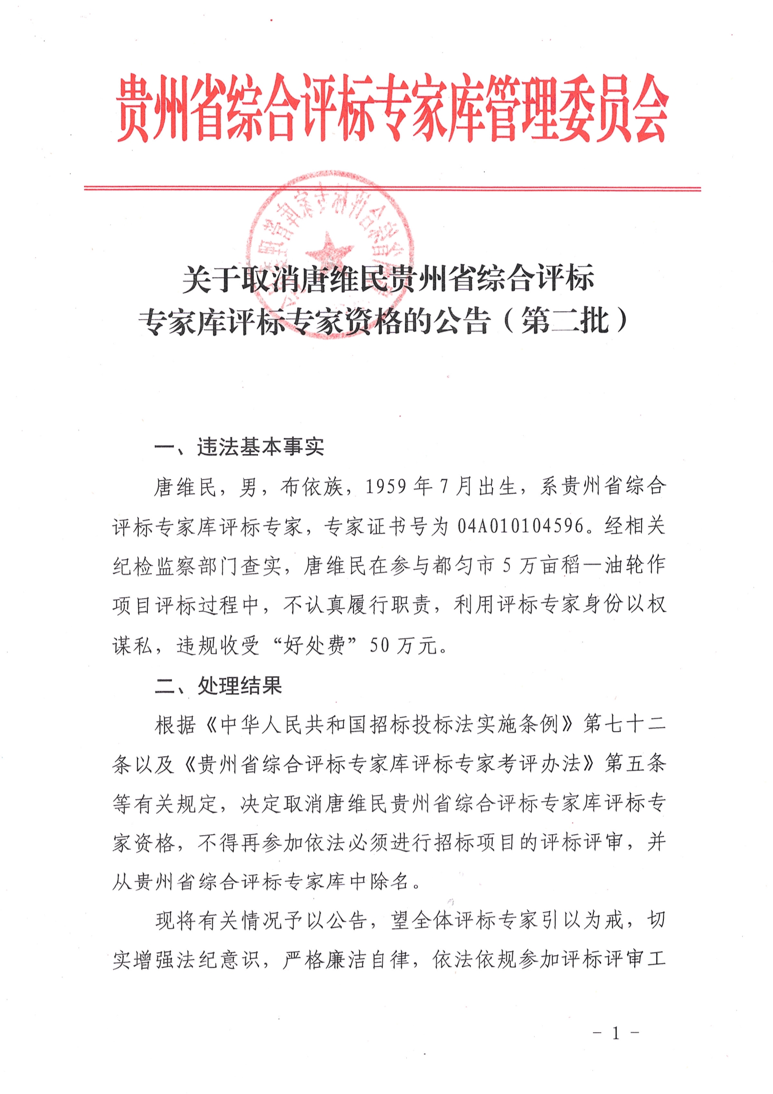 貴州省綜合評標專家庫管理委員會關于取消唐維民評標專家資格的公告