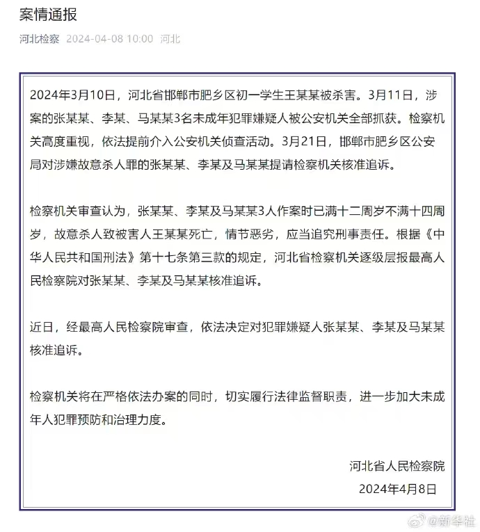 3月17日,河北省邯鄲市肥鄉區委宣傳部官方微信公眾號“微觀肥鄉”發布通報稱,2024年3月10日,邯鄲市肥鄉區初一學生王某某被殺害。3月11日,涉案犯罪嫌疑人被全部抓獲,已依法采取刑事強制措施。