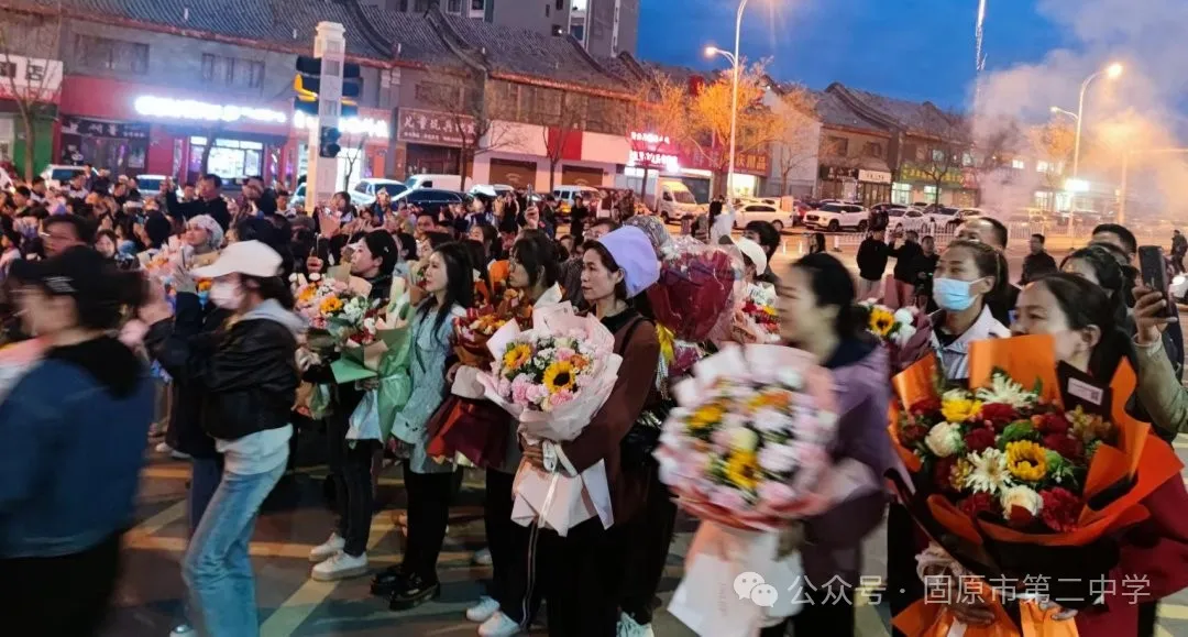 家長制作54條橫幅,從南關橋頭直掛到學校門口,熱情洋溢。手捧鮮花,列隊向老師獻花問好,情暖山城。
