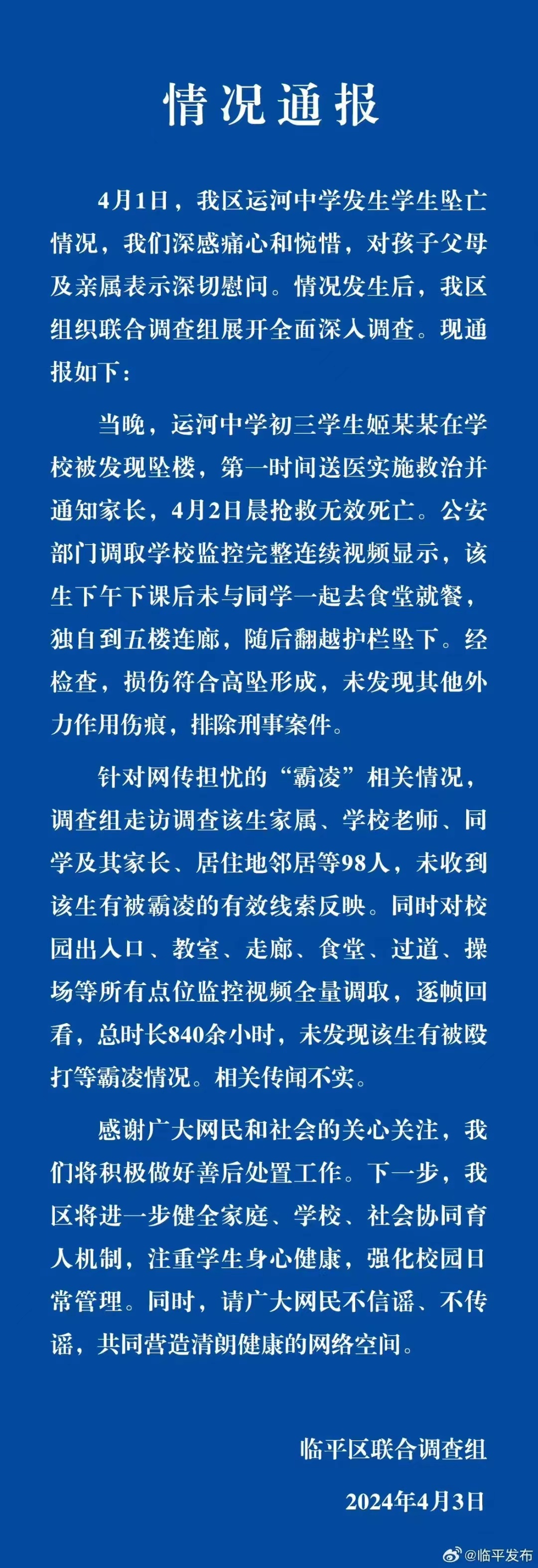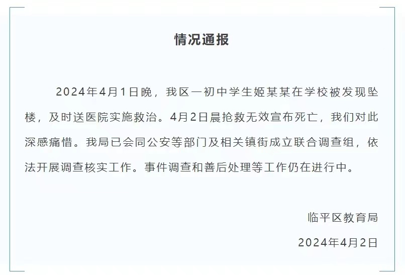 臨平區教育局關于運河中學初三學生姬某某在校墜亡及網傳擔憂“霸凌”情況的通報