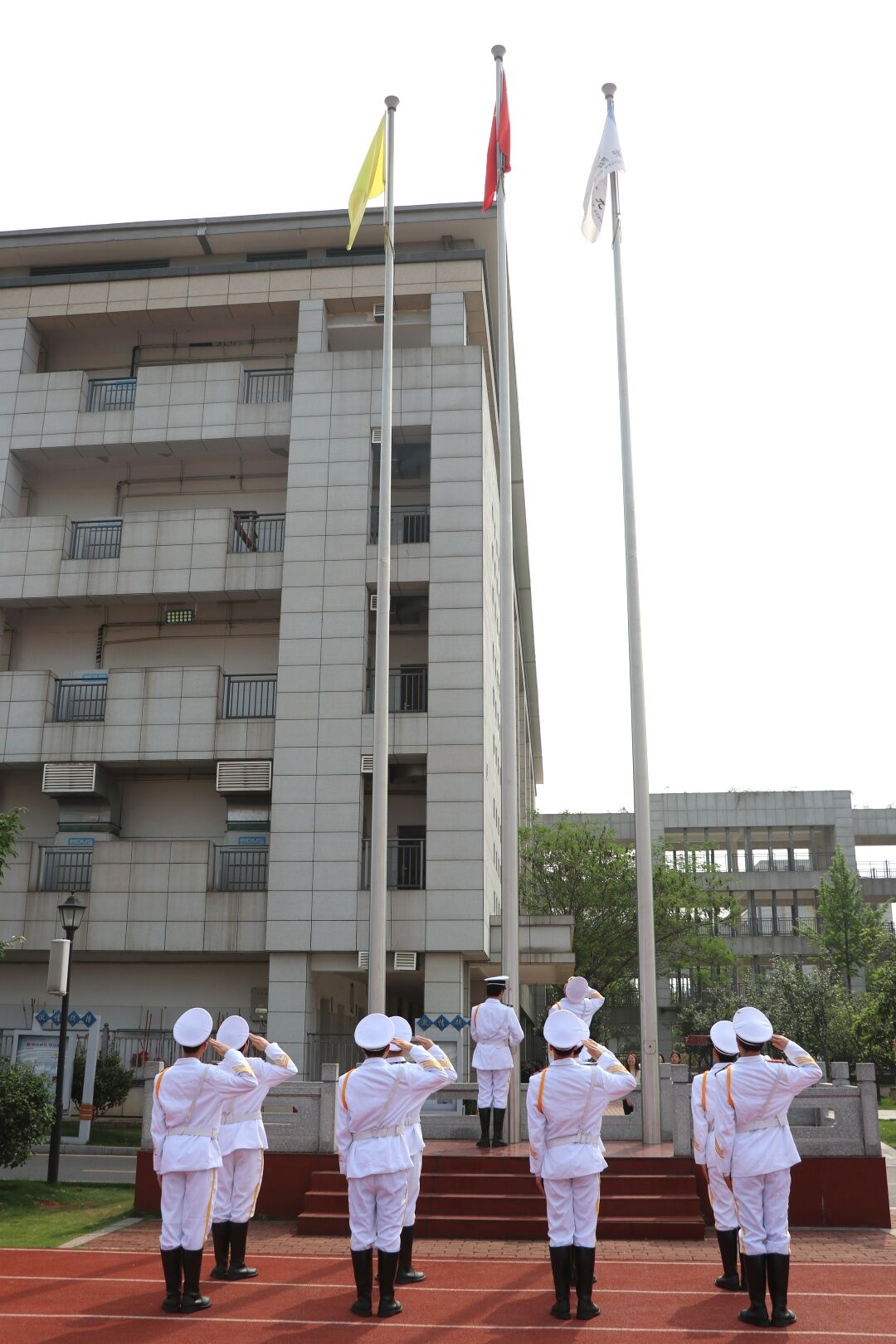 在莊嚴(yán)的國(guó)歌聲中,鮮艷的五星紅旗緩緩升起,迎風(fēng)飄揚(yáng)。全體師生整齊列隊(duì),神情肅穆,向國(guó)旗行注目禮。
