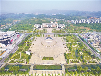 靠兩人手拉手才能環抱住的銀杏古樹,6株一字排開,挺立在縣委、縣政府大樓坪前;與大樓正門相對,空曠的廣場上,8根圖騰石柱屹立于中央,沿著中軸線依次分列成弧線狀。廣場四周,高樓林立……