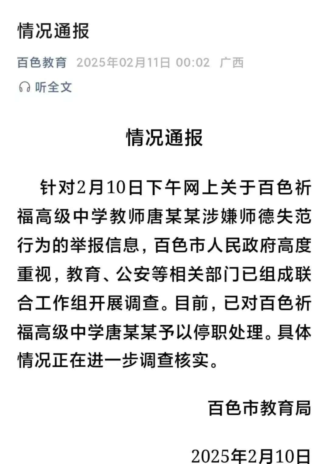 記者2月11日晚從廣西百色市聯(lián)合工作組了解到,針對2月10日網(wǎng)友實(shí)名舉報(bào)百色祈福高級中學(xué)教師唐某某有關(guān)問題,百色市成立由教育、公安、紀(jì)檢監(jiān)察等單位組成的聯(lián)合工作組,迅速開展調(diào)查。經(jīng)調(diào)查核實(shí),唐某某嚴(yán)重違反教師職業(yè)道德,百色市有關(guān)單位依法依紀(jì)給予唐某某開除黨籍、開除公職處分。經(jīng)公安機(jī)關(guān)立案偵查,現(xiàn)已對唐某某采取刑事強(qiáng)制措施,案件正在進(jìn)一步偵辦中。