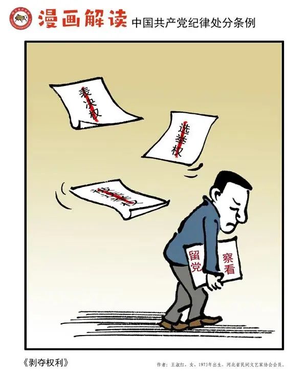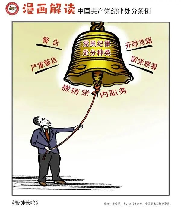 紀法鏈接:對黨員的紀律處分種類:(一)警告;(二)嚴重警告;(三)撤銷黨內職務;(四)留黨察看;(五)開除黨籍。(引自《條例》第二章第八條)