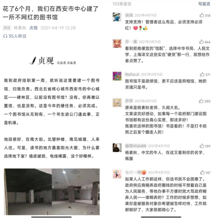 這篇文章我投稿給西安本地的一個(gè)公眾號(hào)“貞觀”,文章的名字叫做《花了6個(gè)月,我們?cè)谖靼彩兄行慕艘凰痪W(wǎng)紅的圖書館》。這篇文章的閱讀量很快到了6萬,比這個(gè)公眾號(hào)平常的閱讀量要高得多。我不停地翻閱評(píng)論區(qū),2分鐘就刷一下,特別開心。