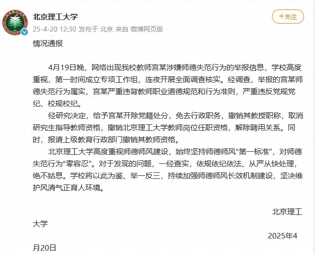 北京理工大學高度重視師德師風建設(shè),始終堅持師德師風“第一標準”,對師德失范行為“零容忍”。對于發(fā)現(xiàn)的問題,一經(jīng)查實,依規(guī)依紀依法、從嚴從快處理,絕不姑息。學校將以此為鑒、舉一反三,持續(xù)加強師德師風長效機制建設(shè),堅決維護風清氣正育人環(huán)境。