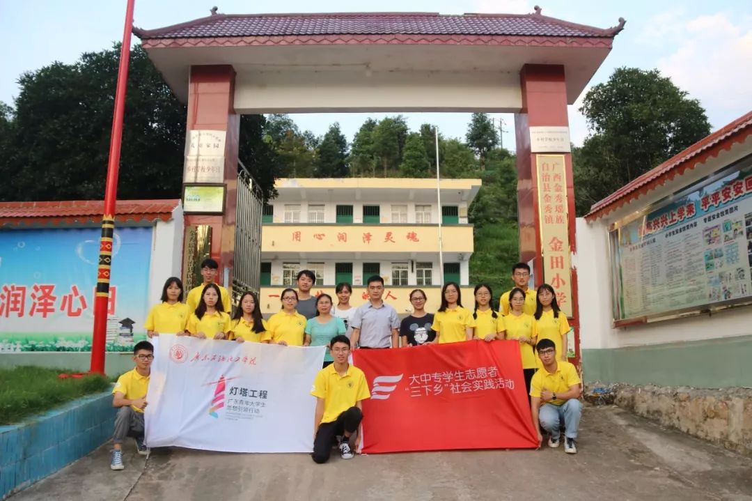 茂南區(qū)團委副書記、掛職金秀縣委辦副主任江靈進,團縣委掛職副書記韋曉玲,團縣委干事李衛(wèi)洋,金田小學(xué)陶永英老師與逐夢心光的全體隊員合影