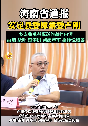 四、海南省教育廳職業(yè)教育與成人教育處原一級(jí)調(diào)研員、定安縣委原常委盧剛違規(guī)收受禮品禮金、違規(guī)接受宴請(qǐng)等問題。2020年至2024年,盧剛多次違規(guī)收受管理和服務(wù)對(duì)象、私營(yíng)企業(yè)主所送禮金和高檔白酒、香煙、茶葉、跑步機(jī)、動(dòng)感單車、桌球設(shè)施等禮品;多次接受管理和服務(wù)對(duì)象、私營(yíng)企業(yè)主安排的宴請(qǐng);將其本人在酒店的食宿費(fèi)用交由工程個(gè)體承包商支付。盧剛還存在其他嚴(yán)重違紀(jì)違法問題。2025年4月,盧剛被開除黨籍、開除公職,涉嫌犯罪問題被移送檢察機(jī)關(guān)依法審查起訴。