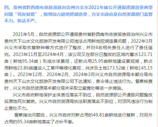 3.貴州省黔西南布依族苗族自治州興義市侵占耕地挖湖造景整改存在形式主義,問(wèn)題反復(fù)發(fā)生。