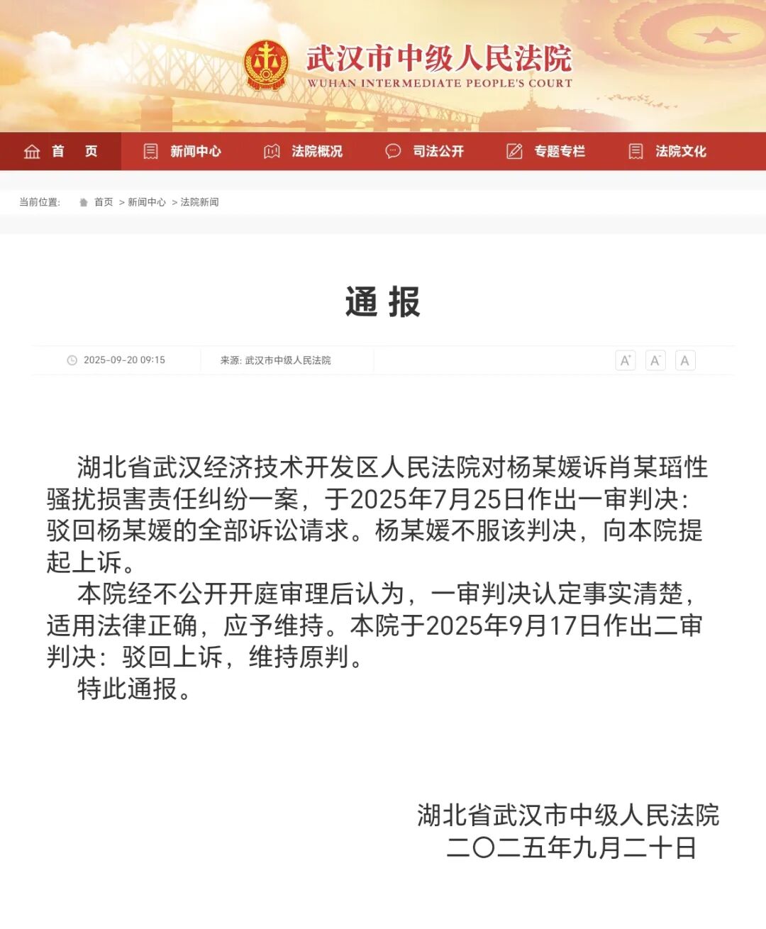 2025年9月17日,湖北省武漢市中級人民法院就楊某媛訴肖某瑫性騷擾損害糾紛一案作出二審判決,決定維持一審判決(7月25日,湖北省武漢經濟技術開發區人民法院一審判決駁回楊某媛的全部訴訟請求)。學校本著充分尊重司法判決的原則,結合調查復核情況,決定撤銷肖某瑫記過處分。