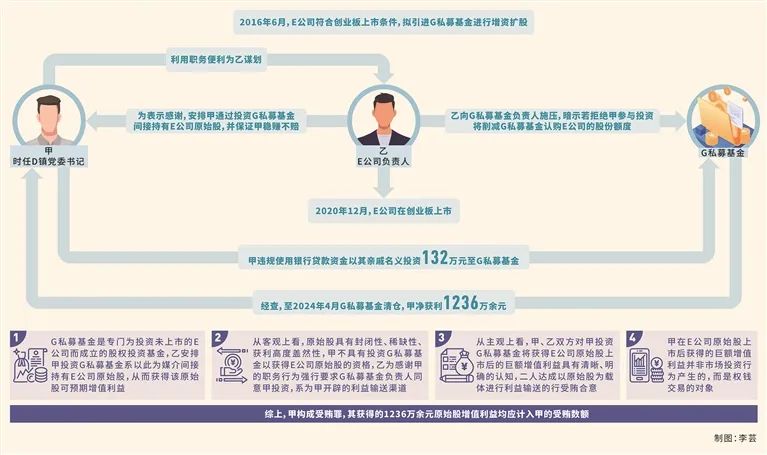 其中,2016年6月,E公司符合創業板上市條件,擬引進G私募基金和H私募基金進行增資擴股。乙為感謝甲在企業用地審批等方面提供的幫助,提議安排甲通過投資G私募基金(該基金是專門為投資未上市的E公司而成立的股權投資基金,按照每股5.5元的價格取得E公司股本600萬股,并辦理相應的變更登記手續)間接持有E公司原始股,并告知甲E公司擬上市情況以及其會與G私募基金簽訂對賭協議(若E公司未實現上市,G私募基金有權要求乙原價回購,并按照年利率10%支付補償款),甲無需承擔市場風險,穩賺不賠,甲表示同意。此后,乙向G私募基金負責人施壓,暗示若拒絕甲參與投資將削減G私募基金認購E公司的股份額度,并將該額度交由其競爭對手H私募基金認購。隨后,甲違規使用銀行貸款資金以其親戚名義投資132萬元至G私募基金(根據相關規定,私募基金投資者應當具備相應資金實力,不得用貸款資金從事股本權益性投資,甲的行為不符合規定)。2019年6月,I私募基金以每股11.52元溢價收購G私募基金持有的部分E公司股份。2020年12月,E公司在創業板上市。經查,至2024年4月G私募基金清倉,甲凈獲利1236萬余元。