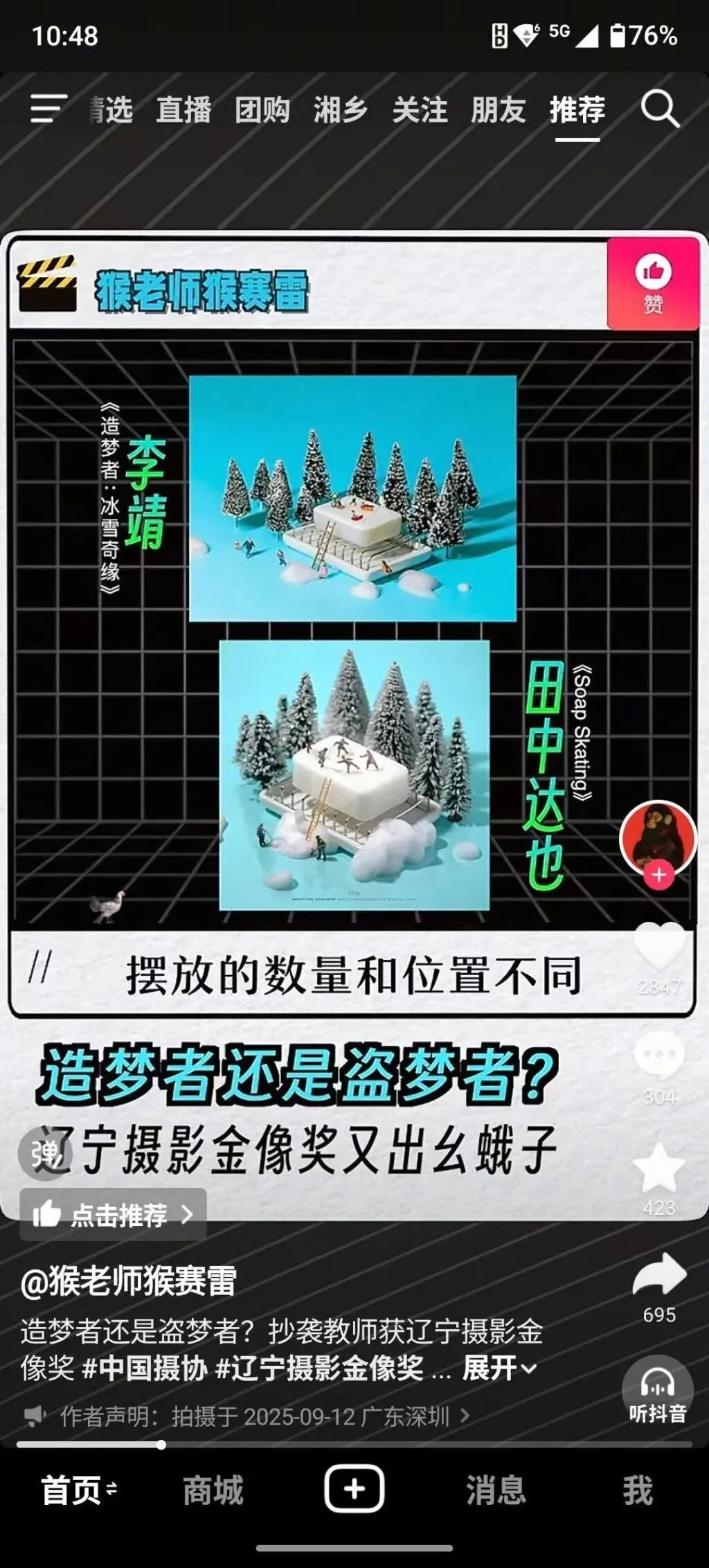 公開資料顯示,李靖為遼寧省攝影家協(xié)會會員,現(xiàn)任遼寧傳媒學院美術(shù)系系主任。李靖的作品《造夢者:冰雪奇緣》,此前被曝與另一作者的作品十分相似。作為高校老師,參評作品被組委會查證存在抄襲行為,屬于嚴重學術(shù)不端。大學不能在其獲獎時,把獲獎作為學校榮譽,而在發(fā)現(xiàn)其存在抄襲行為后,卻淡化處理或不處理。