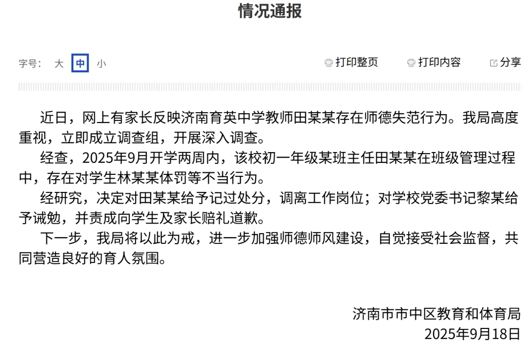 近日,網(wǎng)上有家長(zhǎng)反映濟(jì)南育英中學(xué)教師田某某存在師德失范行為。我局高度重視,立即成立調(diào)查組,開(kāi)展深入調(diào)查。