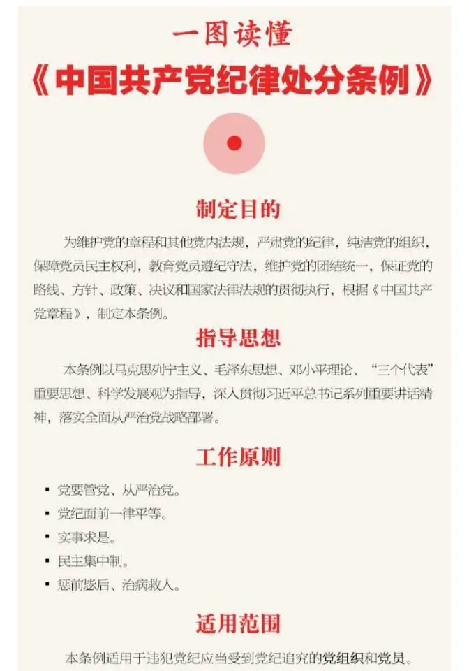 第一條 為了維護黨章和其他黨內法規,嚴肅黨的紀律,純潔黨的組織,保障黨員民主權利,教育黨員遵紀守法,維護黨的團結統一,保證黨的路線、方針、政策、決議和國家法律法規的貫徹執行,根據《中國共產黨章程》,制定本條例。