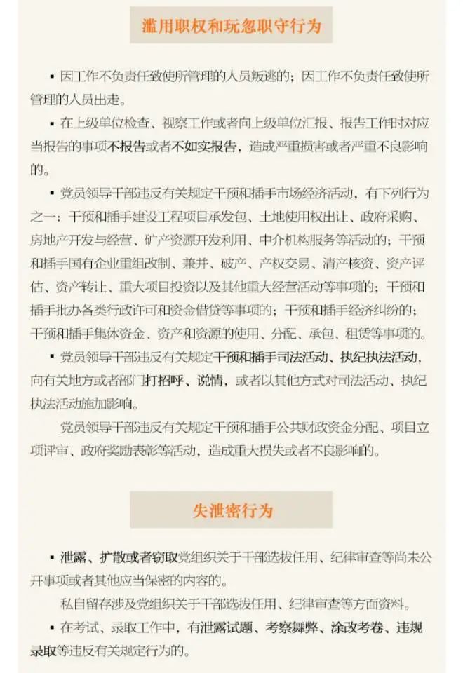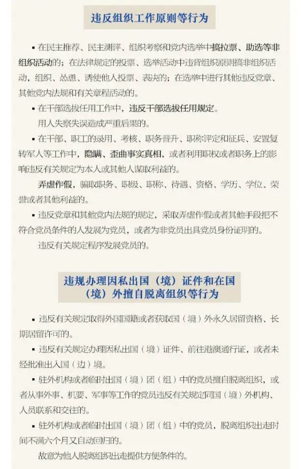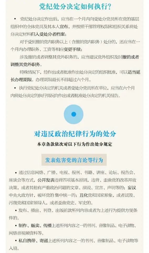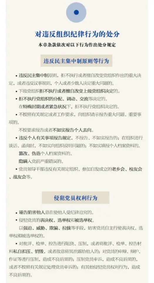 第一百二十八條 泄露、擴散或者打探、竊取黨組織關于干部選拔任用、紀律審查、巡視巡察等尚未公開事項或者其他應當保密的內容的,給予警告或者嚴重警告處分;情節較重的,給予撤銷黨內職務或者留黨察看處分;情節嚴重的,給予開除黨籍處分。