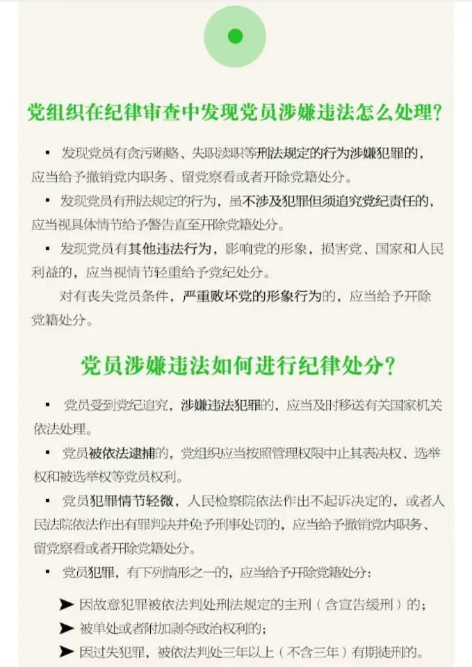 第二十七條 黨組織在紀律審查中發現黨員有貪污賄賂、濫用職權、玩忽職守、權力尋租、利益輸送、徇私舞弊、浪費國家資財等違反法律涉嫌犯罪行為的,應當給予撤銷黨內職務、留黨察看或者開除黨籍處分。