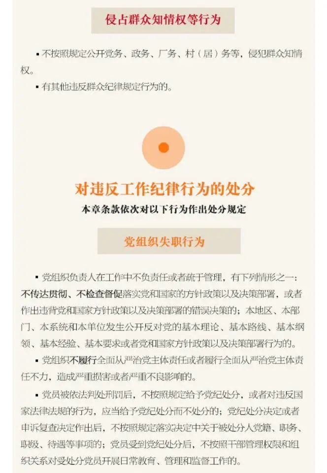 第一百一十九條 不按照規定公開黨務、政務、廠務、村(居)務等,侵犯群眾知情權,對直接責任者和領導責任者,情節較重的,給予警告或者嚴重警告處分;情節嚴重的,給予撤銷黨內職務或者留黨察看處分。