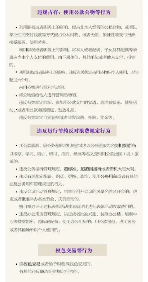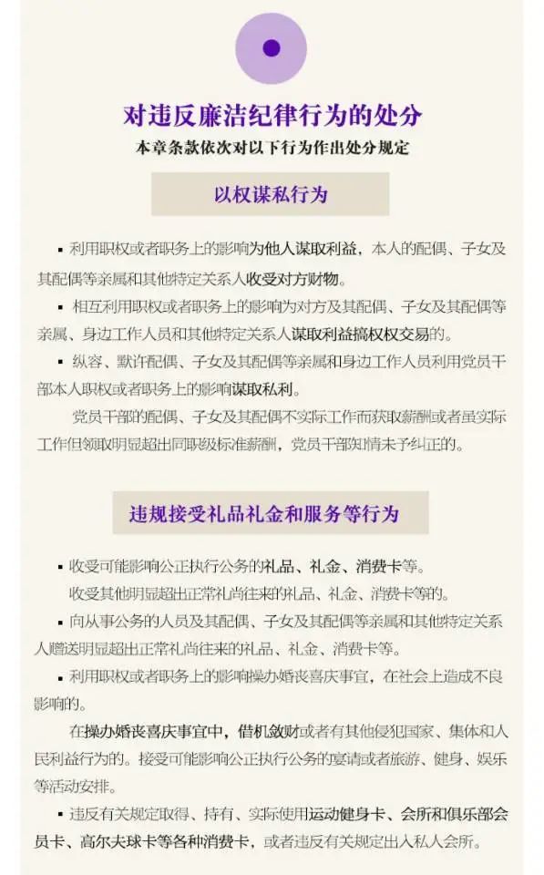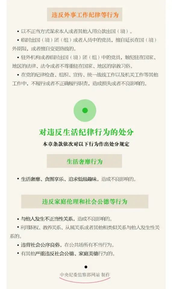 本條規定的“其他嚴重違反社會公德、家庭美德行為”,主要是指本章其他條文未涉及,而又應當受到黨紀責任追究的嚴重違反社會公德、家庭美德的行為,本條是生活紀律的兜底條款。違反本章規定的行為,與黨員應當遵守的生活紀律要求相比,或者與現實發生的黨員違反社會公德、家庭美德的道德規范的行為相比,只是情節較為嚴重必須予以黨紀處分的一小部分行為。對于大多數違反道德規范的行為,靠社會輿論、教育感化等道德自身的力量來糾正和調整,只有一部分列入黨紀、法律的范圍來進行糾正和調整。本著紀法分開的原則,對嚴重侵害國家和社會利益以及嚴重侵犯他人權益的行為,國家法律已將其作為違法犯罪行為進行刑事處罰或者行政處罰。本章未予列入。