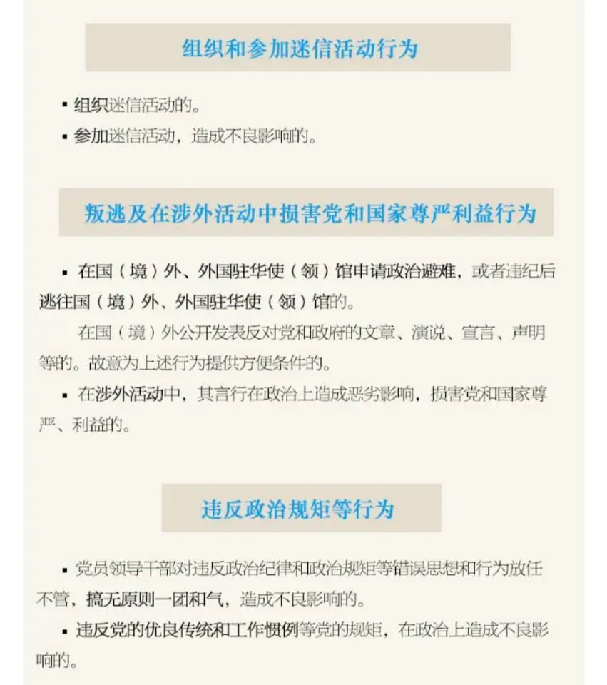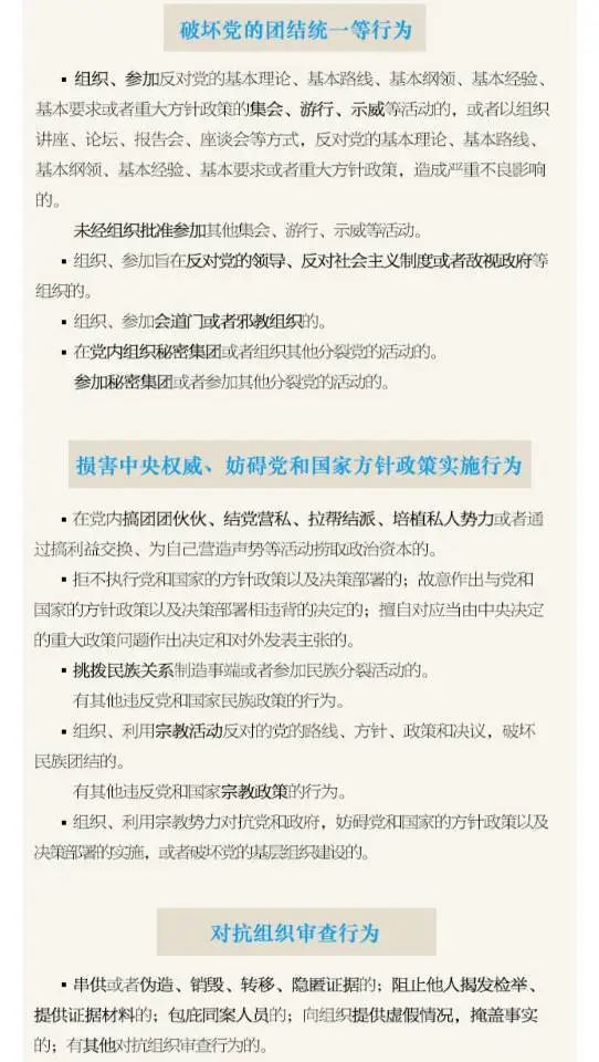 第一百三十七條 違背社會公序良俗,在公共場所有不當行為,造成不良影響的,給予警告或者嚴重警告處分;情節較重的,給予撤銷黨內職務或者留黨察看處分;情節嚴重的,給予開除黨籍處分。