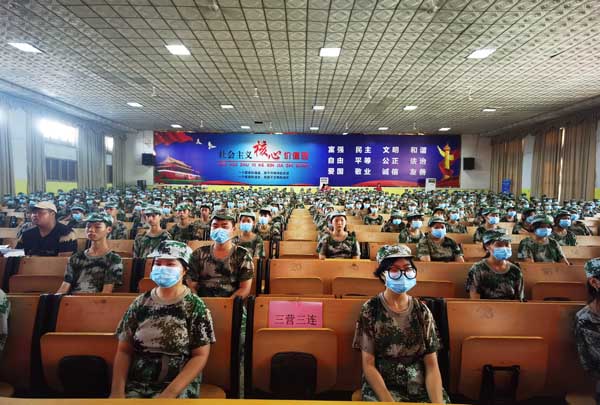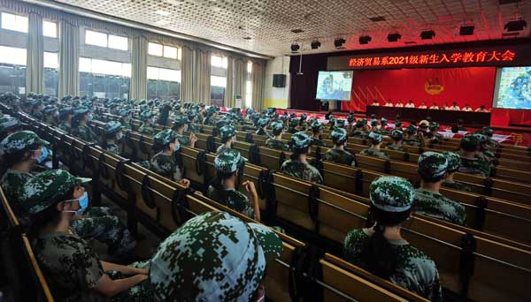 9月5日下午三點,經貿系組織2021級新生在學院大禮堂召開入學教育大會。經貿系行政領導、各教研室主任及新生班主任、連隊教官參加大會。會議由綜合科科長唐佳潔主持。