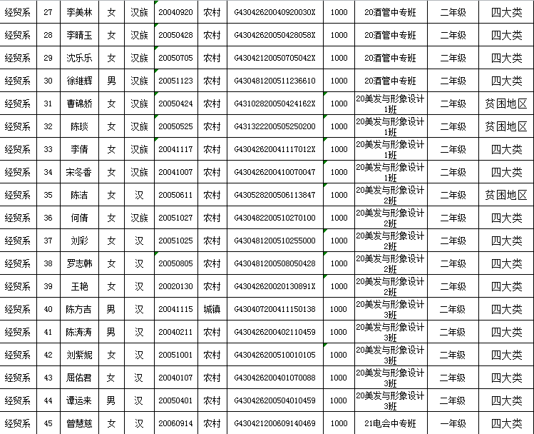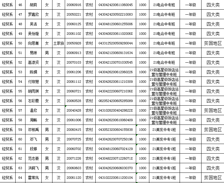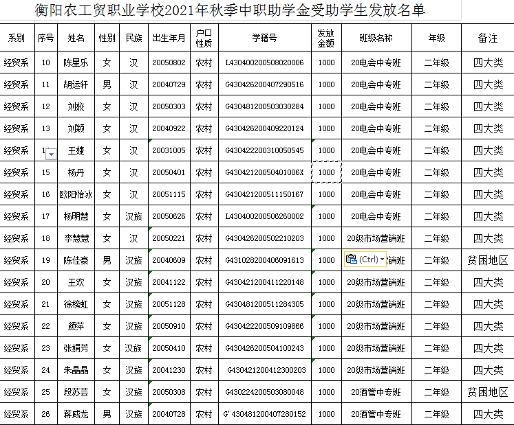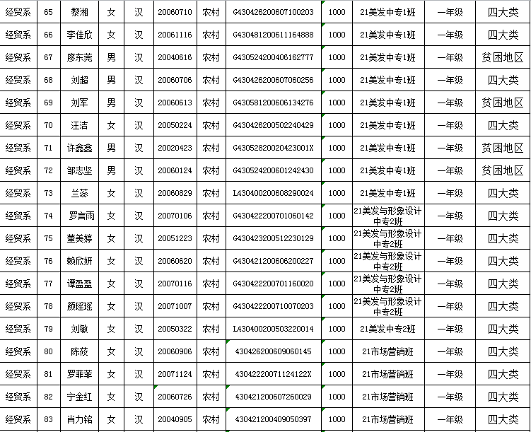 衡陽(yáng)農(nóng)工貿(mào)職業(yè)學(xué)校經(jīng)貿(mào)系2021年度秋季助學(xué)金評(píng)定名單公示