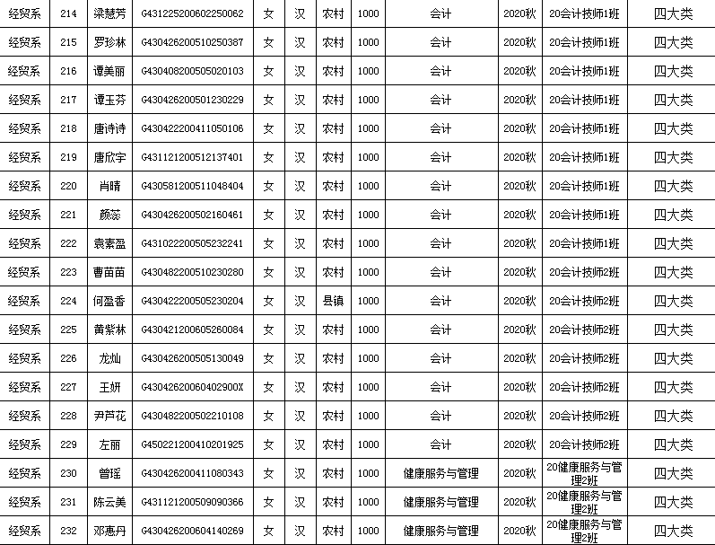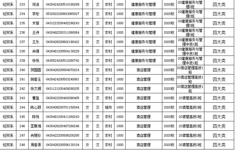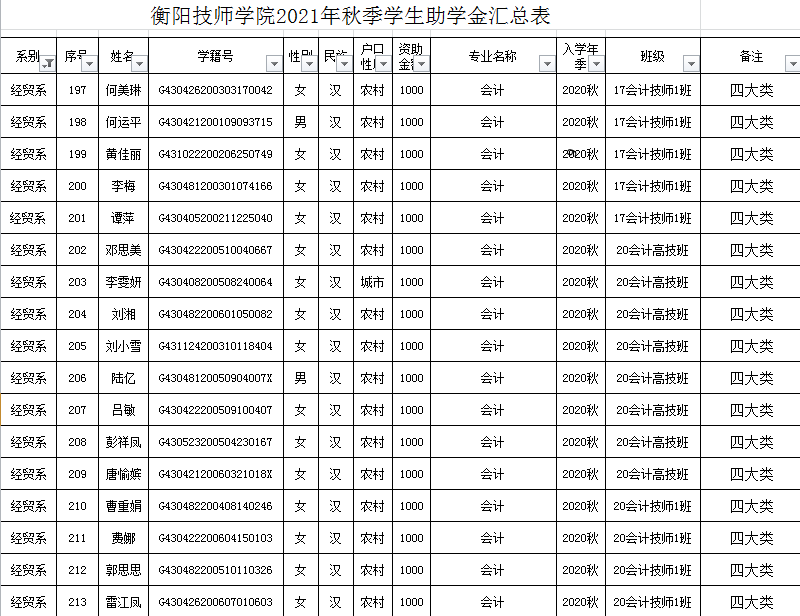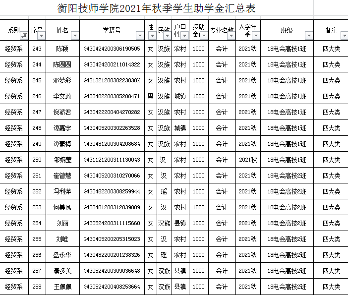 衡陽農工貿職業學校經貿系2021年度秋季助學金評定名單公示