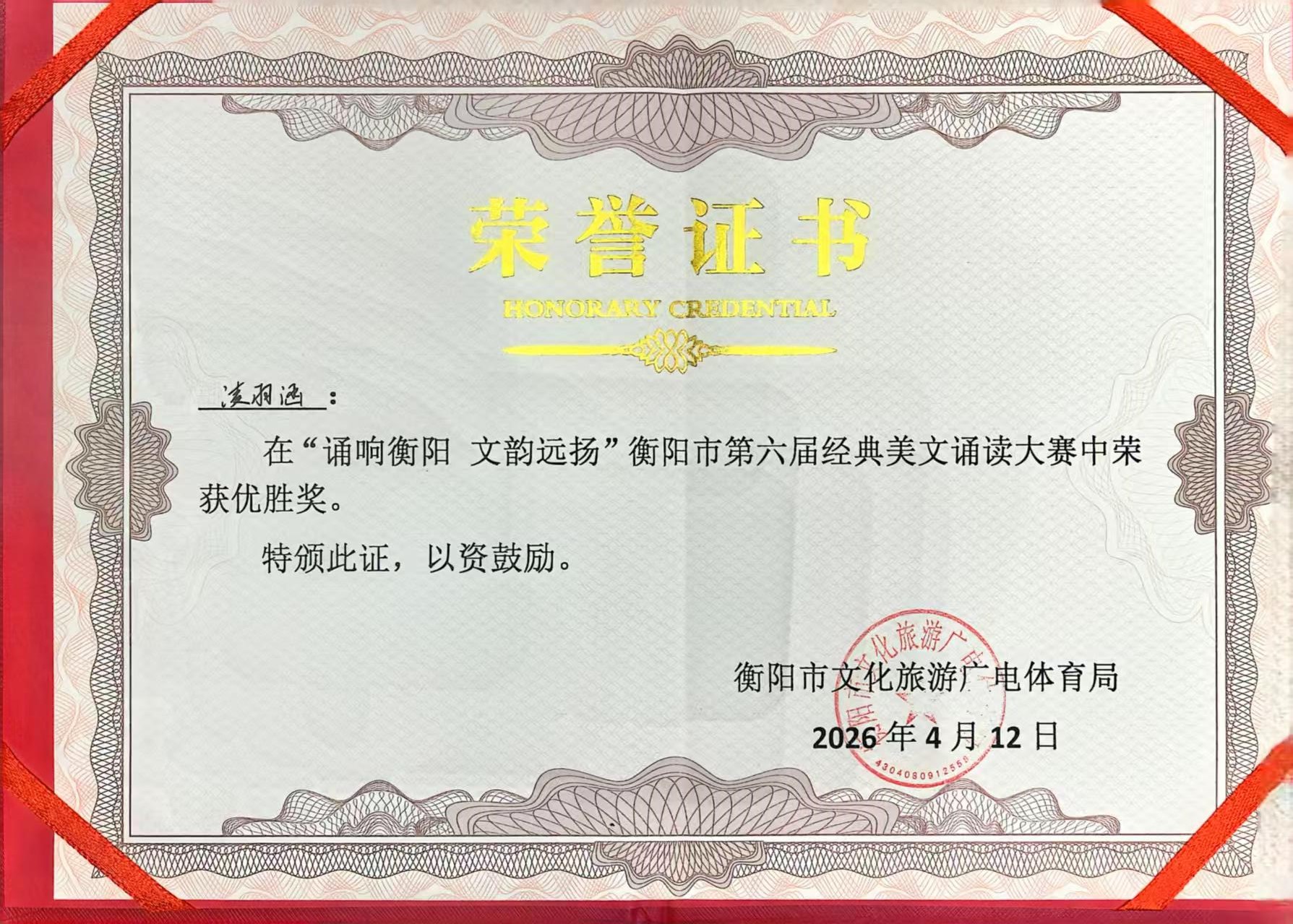 本次比賽由衡陽市文旅廣體局主辦,參賽選手以衡陽市各校教師、機關單位工作人員為主,整體水平高、競爭激烈。面對實力強勁的對手,凌羽涵同學從容自信、聲情并茂,充分展現(xiàn)了扎實的語言功底與良好的精神風貌。