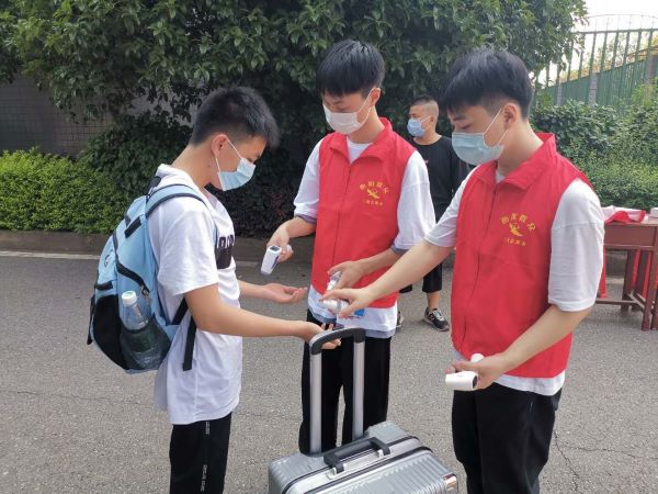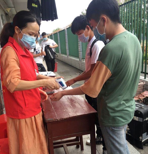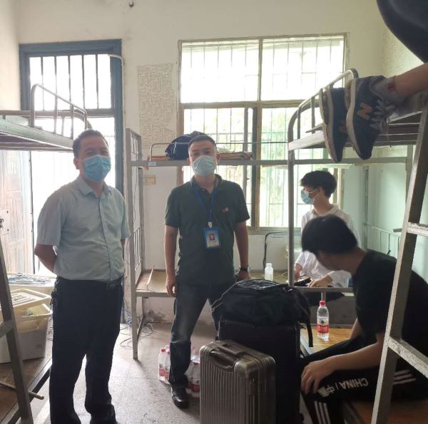 在男生宿舍1棟,參與志愿服務活動的教師對返校同學進行體溫檢測及消毒,查看并勸導學生戴好口罩,不串門,搞好宿舍及個人衛生,確保返校師生的安全和健康。