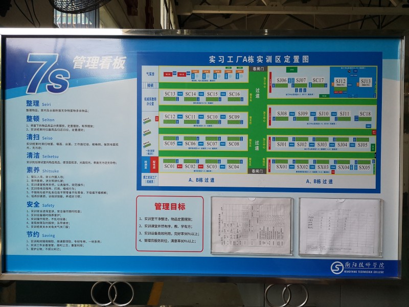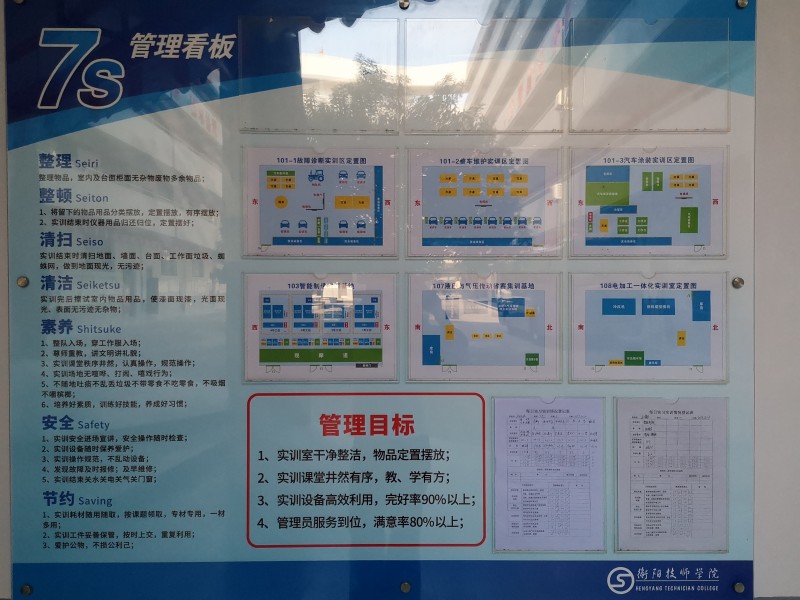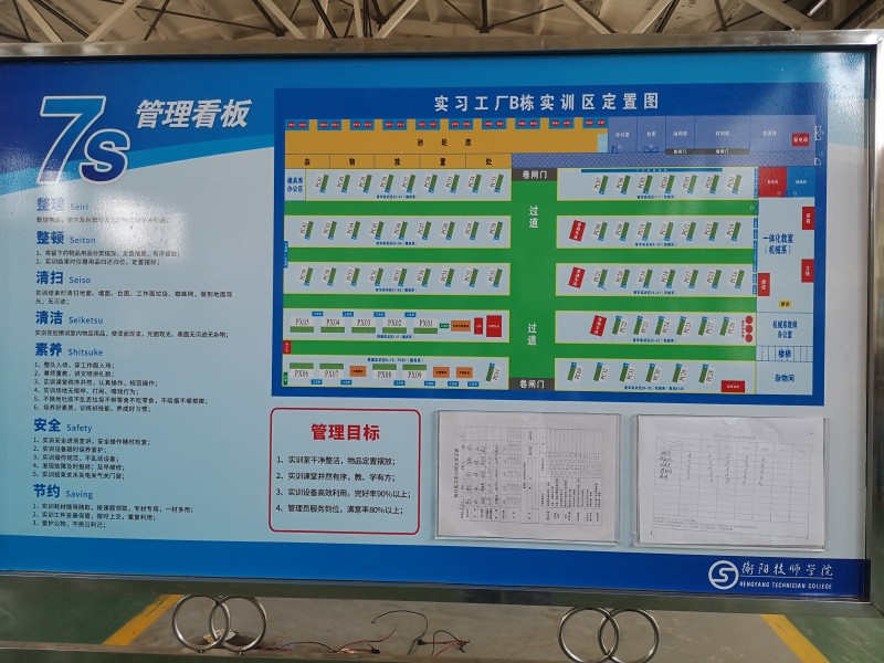 為進一步加強7S管理,提升管理效果,2019年把“7S看板管理”作為實訓(xùn)中心工作質(zhì)量提升內(nèi)容:在一體化樓和實習(xí)工廠設(shè)立7個7S管理看板,明確7S管理要求,實現(xiàn)四個管理目標(biāo):實訓(xùn)室干凈整潔,物品定置擺放;實訓(xùn)課堂井然有序,教、學(xué)有方;實訓(xùn)設(shè)備高效利用,完好率90%以上;管理員服務(wù)到位,滿意率90%以上。要求管理員每天每堂課做好服務(wù)和登記,填寫好表格,及時插在看板指定位置,便于檢查考核。 通過一年的實施,7S管理效果明顯,實訓(xùn)場地干凈清潔,室內(nèi)物品定置擺放,設(shè)備完好率達96%以上,管理員服務(wù)滿意率達97.2%。來人來客及各級領(lǐng)導(dǎo)到實訓(xùn)場地參觀后都留下了良好的印象。
