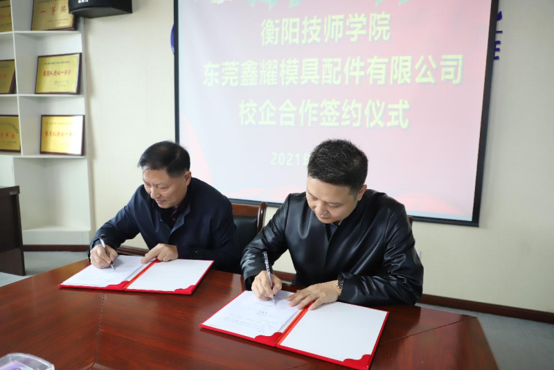 黨委委員、副院長成朝陽同志主持會議。東莞鑫耀模具配件有限公司總經理顏日輝和衡陽技師學院黨委委員、副院長劉忠賢進行簽約。學院教務處、實訓中心和模具設計與制造系主要負責人參加了簽約儀式。