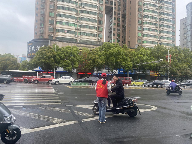 “叔叔,您好啊,非機動車不得隨意掉頭,逆行是非常危險的,還有請您帶好頭盔,安全第一。”活動中,學院志愿者正在對一位逆行的叔叔進行耐心勸導。