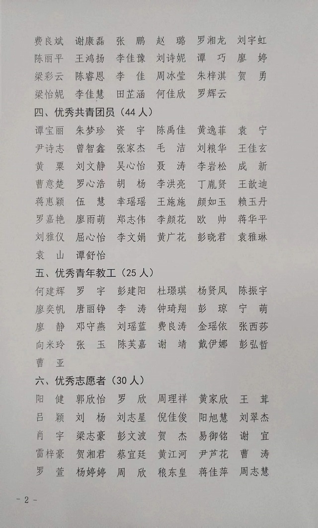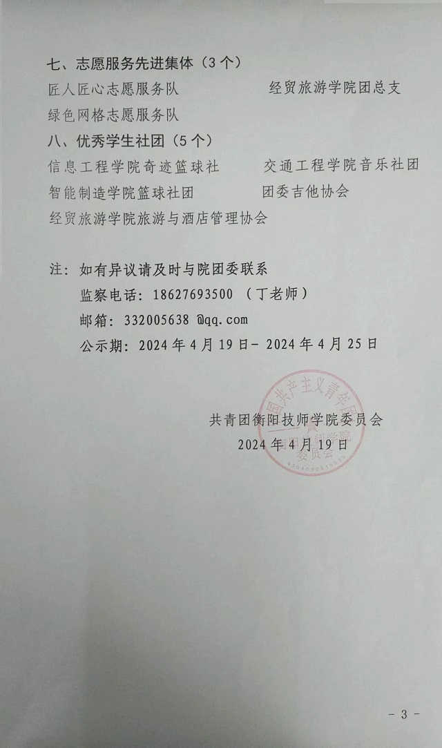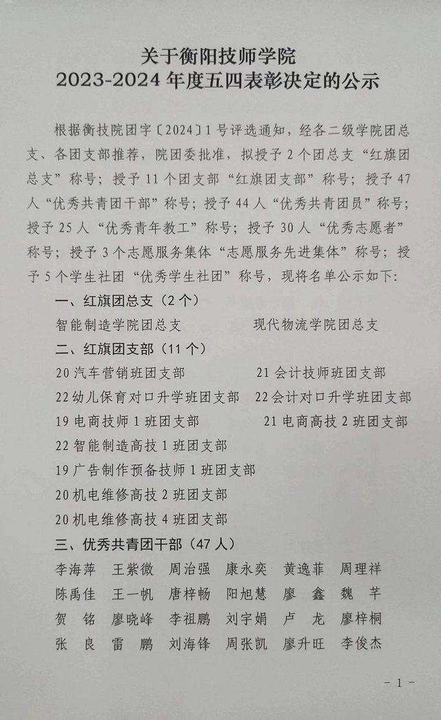 關于衡陽技師學院2023-2024年度五四表彰決定的公示
