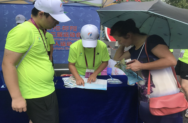 每天上午7點,志愿者們頭戴白帽、身穿綠T恤到達賽場布置志愿服務場地,用熱情和愛心為運動員、觀眾、周邊群眾提供水、醫療用品等物品,熱心為前來咨詢的市民解惑。
