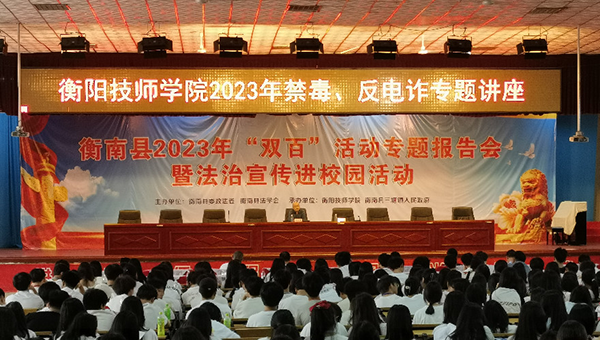 為學(xué)習(xí)宣傳貫徹習(xí)近平法治思想,弘揚(yáng)法治精神,結(jié)合學(xué)習(xí)貫徹習(xí)近平新時代中國特色社會主義思想主題教育,6月6日,學(xué)院開展法治宣傳進(jìn)行校園活動暨2023年禁毒、反電詐專題講座,并聯(lián)合衡南縣政法委舉辦衡陽市、衡南縣法學(xué)會“雙百”活動專題報告會。學(xué)院黨委副書記、院長廖與飛出席并致辭。衡陽市政法委二級調(diào)研員宋景軍,衡南縣委常委、縣委政法委書記蔡志剛出席活動。學(xué)院黨委委員、副院長王瀾主持報告會。