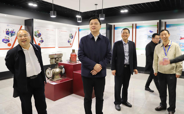 廖健(左二)、何東球(右二)、邱家才(右一)、陳群洲(左一)參觀學(xué)院鉗工非遺傳習(xí)所
