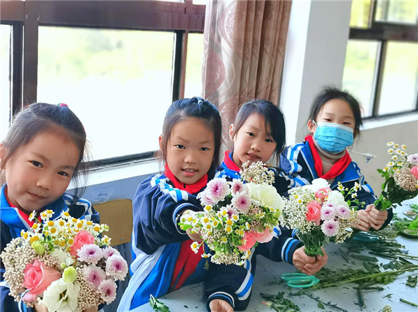 孩子們對支教老師的到來期盼已久,很快,插花教室就熱鬧起來。因為來了一些新學員,插花班老師降低了難度,從基礎的花束開始。老師先耐心介紹了這次的插花主題和花材特點,再手把手傳授插花的要領和技巧。在她的帶領下,孩子們大膽地挑花、剪枝、搭配、捆扎,盡情創造美麗?;ㄏ銖浡g教室,孩子們童音歡快,張張笑顏如花般燦爛。