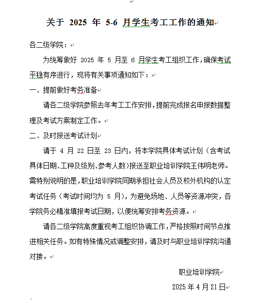 最新!籌做好 2025 年 5 -6 月份學生考工組織工作