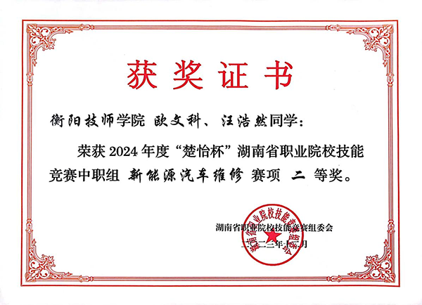 歐文科榮獲2024年度“楚怡杯”湖南省職業院校技能競賽中職組新能源汽車維修賽項二等獎