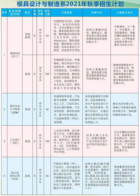 衡陽技師學院2021年秋季模具設計與制造系招生簡章